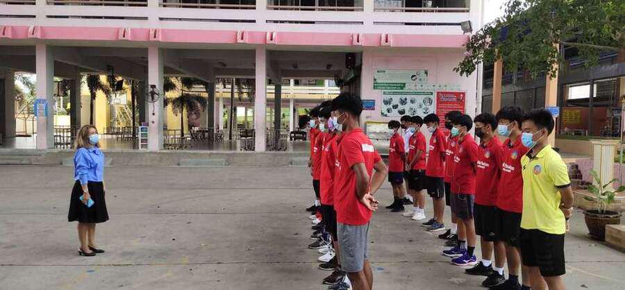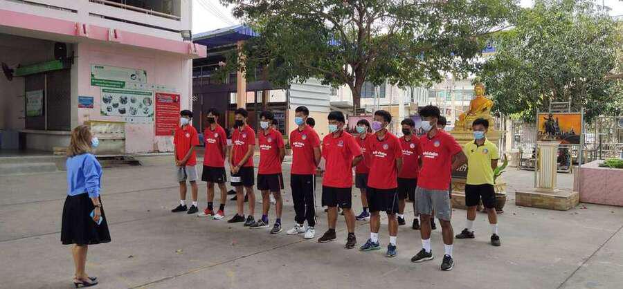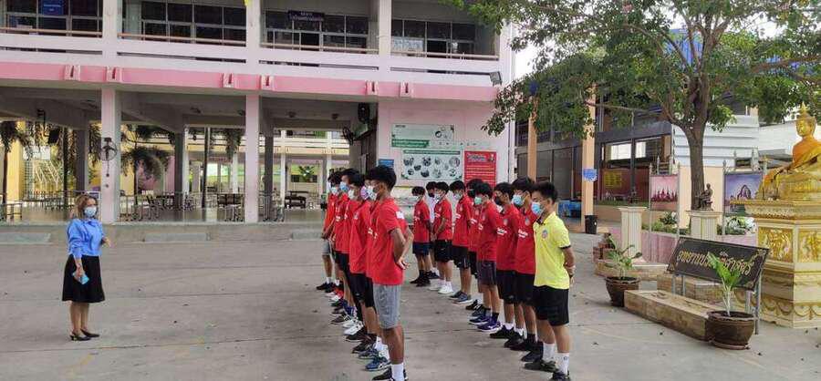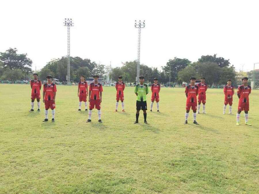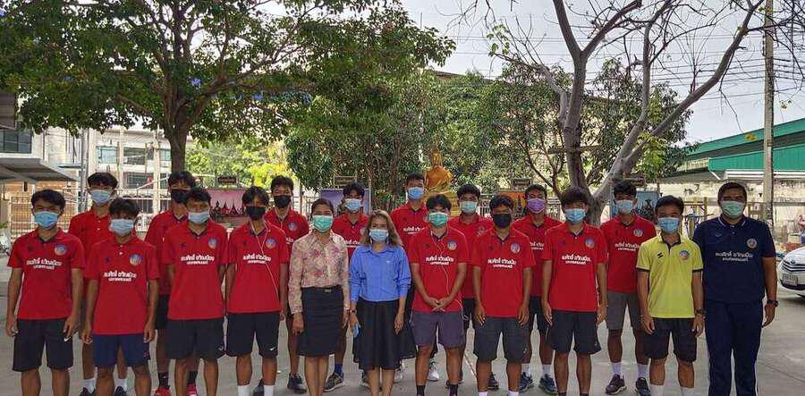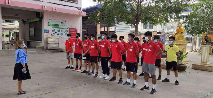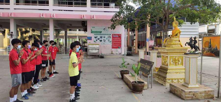 นักเรียนโรงเรียนเทศบาลอ้อมน้อย รุ่นอายุ 18 ปี เข้าร่วมแข่งขันฟุตบอลของกรมพลศึกษา ปี 2563 ฝึกซ้อมโดย ครูไตรทิพย์ แจ่มประเสริฐ (ครูโต้) เข้าขอพรจากท่านรองผู้อำนวยการสถานศึกษา S:0
