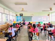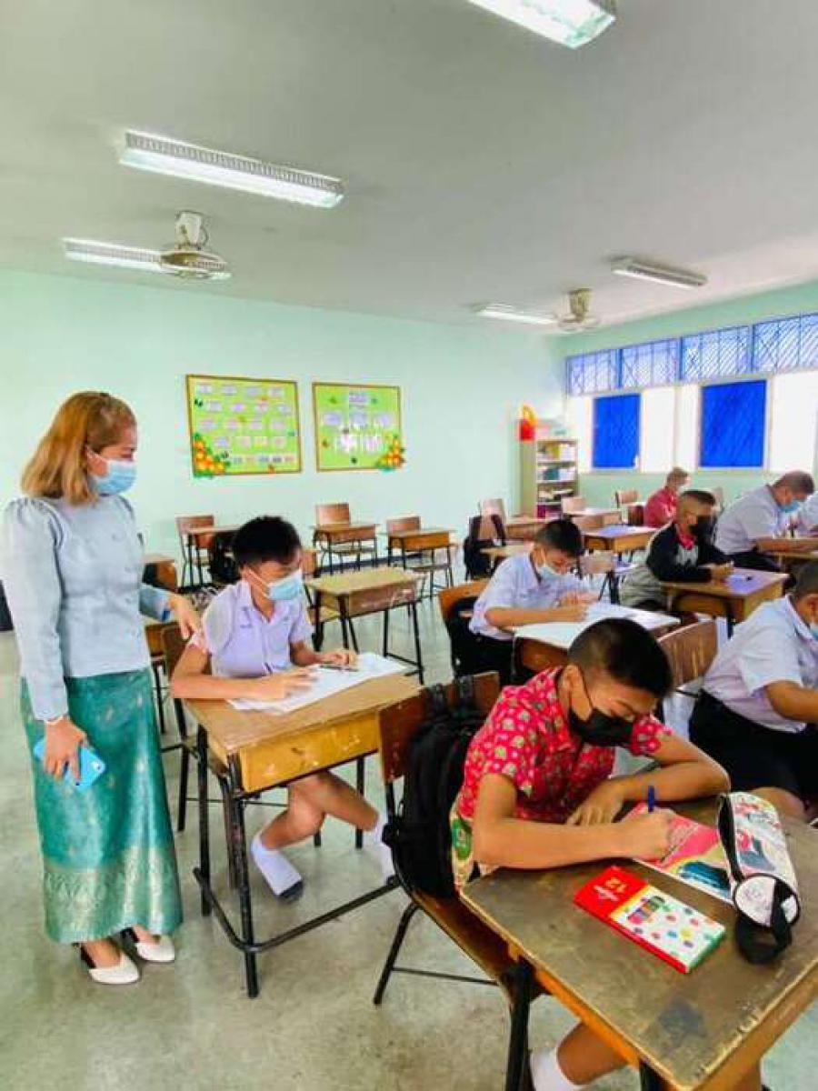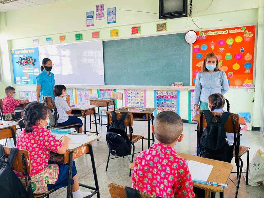 นางสาวบุษยพรรณ์ แสงไชยพัฒน์ รองผู้อำนวยการสถานศึกษา รักษาราชการในตำแหน่ง ผู้อำนวยการสถานศึกษา นิเทศการจัดการเรียนการสอนครูผู้สอน ระดับประถมศึกษา ประจำภาคเรียนที่ 2 ปีการศึกษา 2563 พร้อมให้คำแนะนำการจัดระเบียบห้องเรียนเพื่อความเป็นระเบียบเรียบร้อย และเป็นไปตามมาตรการเฝ้าระวัง ป้องกัน และควบคุมโรคCOVID-19 S:0